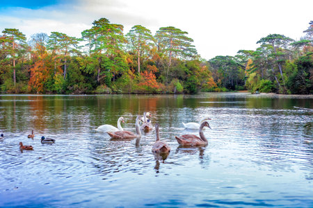 White and brown juvenile swans swimming with ducks on autumn lake. Waterfowl birds swims across still water of pond and vibrant colors of fall forest reflected in calm water, selective focus