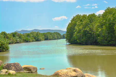 The ancient Mangrove forest with the reflect tranquil water at noon in Rayong province, Thailand.