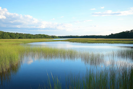Serene view of a calm river winding through lush green wetlands under a bright blue sky with soft, white clouds. Peaceful and scenic.
