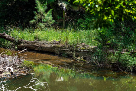 Mangrove tree on the riverbank with vibrant yellow and green colours in a lush rain forest in the tropical undergrowth in the Seychelles