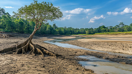 Mangrove forest and calm river in the morning. Minimalist landscape. Generative AI .