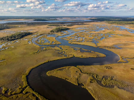 Aerial View of Northeast Florida Wetlands in St Johns County Florida with snaking waterway.Winter 2022St Johns CountyFlorida