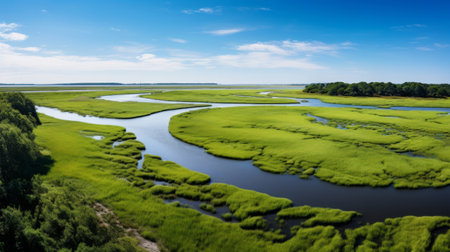 A tranquil river meandering through vibrant green marshlands, surrounded by dense vegetation under a clear sky. perfect for showcasing natural beauty, outdoor adventure, travel destinations, or tranquility themes. Generative AI