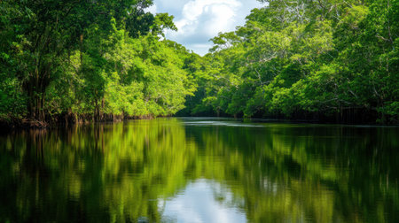 AI Generated. Pristine river reflecting dense greenery in a tranquil jungle landscape during the early morning hours