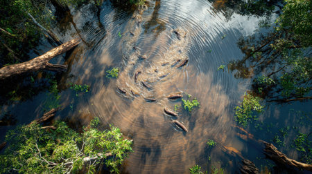A breathtaking aerial view showcasing a vibrant river winding through lush wetlands. The scene captures the essence of natural beauty and serene landscapes filled with rich greenery and wildlife.