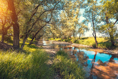 View of the brook in the forest on a sunny day. Nature landscape