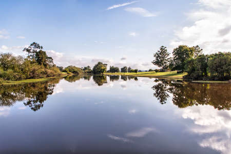 Photograph of trees and clouds reflecting in Yarramundi Lagoon in the Hawkesbury region of New South Wales in Australia.