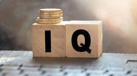 Intelligence quotient. Word IQ on wooden cubes put on laptop keyboard. IT business. e-commerce, internet trading concept.