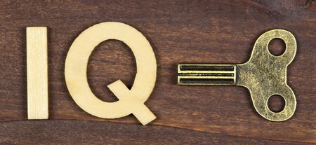 Web banner of intelligence quotient, iq test, brain concept, winding key with letters on a brown wooden background