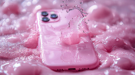 A pink smartphone captured amidst a vibrant splash of water and foam, styled on a glossy surface for a bold and playful look.