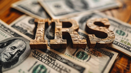 Detailed view of wooden IRS letters on scattered U.S. dollar bills, suggesting concepts of taxation, finance, and government revenue.