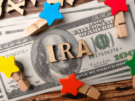 Words ROTH IRA laid on wooden surface by metal letters with us dollar banknotes