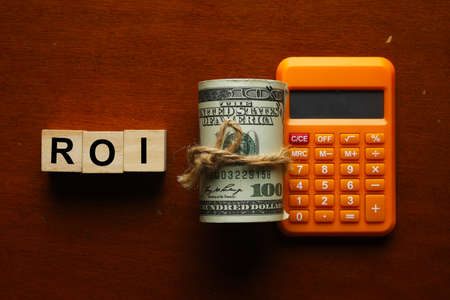 ROI wooden block with fake money and calculator. ROI stands for return of investment.