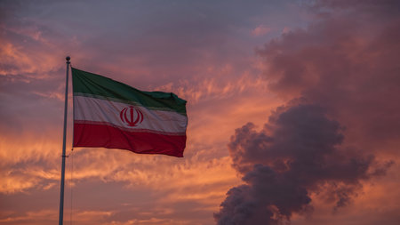 Iranian national flag with green, white, and red stripes waving on a mosque dome against a vibrant sunset sky. symbolizes nation, government, and culture.