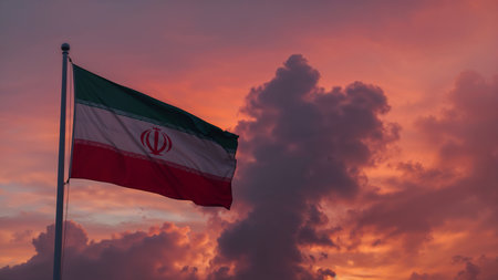Iranian flag in front of mosque architecture at golden hour, showing cultural religious symbolism.