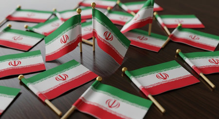 Iranian flags, flags of Islamic Republic of Iran, waving against blue sky