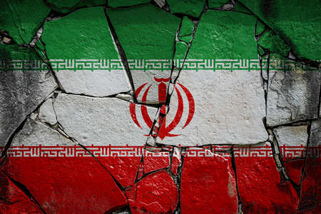 National flag of Iran depicting in paint colors on an old stone wall. Flag banner on broken wall background.