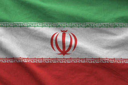 Iran flag is depicted on a sports cloth fabric with many folds. Sport team waving banner