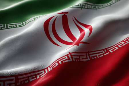 Close-up view of a waving Iranian flag highlighting its rich colors and intricate details, symbolizing national pride and cultural identity.