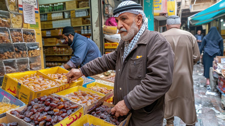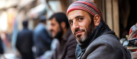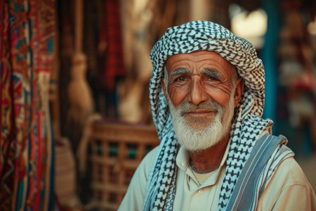 Portrait of a senior arab man wearing a keffiyeh, depicting a warm, welcoming smile in a local market setting