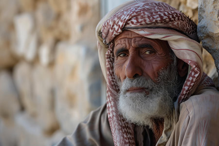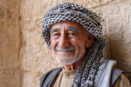 Portrait of an elderly man with a keffiyeh, showing wisdom and age, against a stone wall backdrop