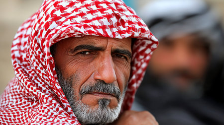 Close-up portrait of a Middle Eastern man with a weathered face, wearing a traditional red and white keffiyeh. His intense gaze conveys wisdom and resilience.