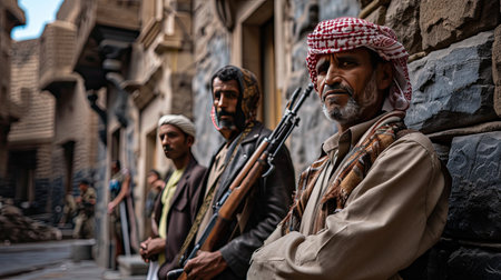 A line of Middle Eastern men, the first wearing a red and white keffiyeh, stare intently. Shallow depth of field blurs the background, emphasizing the man's weathered face.