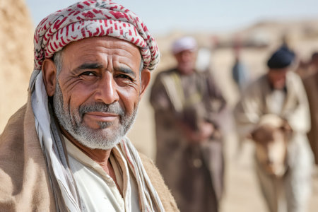 Arab man with weathered face smiling, wearing a traditional headdress with other people in the background