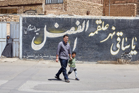 Kashan, Iran - April 26, 2017: A young man and a little boy walk along the street past the wall with inscriptions in Farsi.