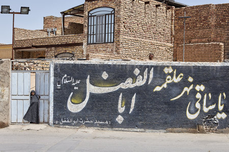 Kashan, Iran - April 26, 2017: A Muslim woman in a patterned religious veil, stands in the gate of a high fence on the wall of which the inscription is in Persian.