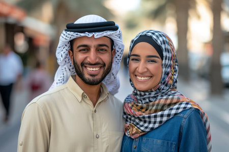Portrait of happy Muslim couple standing in street, embracing each other.