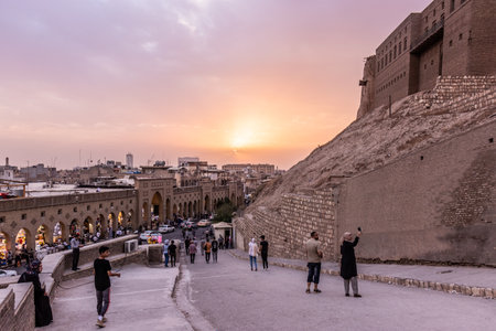 Erbil, Iraq - 13 Mar, 2022 : ariel picture for Erbil city in the north of iraq in Kurdistan Region, and showing many peoples they were tourists And some residential buildings, and many of cars and street and watch tower.