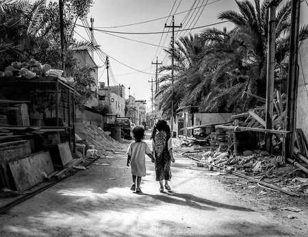 Two children walking down a narrow street lined with palm trees and construction debris, in black and white