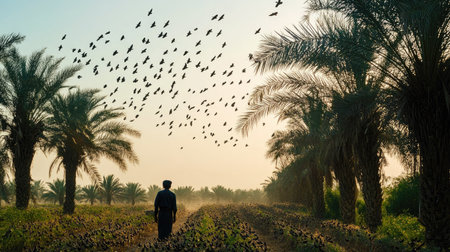 A farmer standing in a field of date palm trees, with a flock of birds flying overhead.