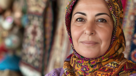 A joyful woman from Afghanistan smiles warmly, displaying a sense of resilience. Her colorful scarf reflects cultural heritage as she sits in her inviting home environment. Generative AI.