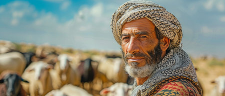 Elderly man smiling warmly in traditional headscarf. Generative AI