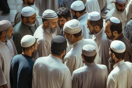 A group of men wearing traditional attire are engaged in conversation outside a mosque, likely after a prayer service. The setting is bustling, indicating a lively atmosphere.