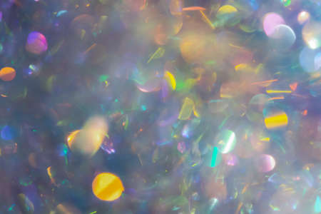 Abstract holiday background made of multicolored bokeh. Fancy sparkling iridescent pearl with silver effect creative design for Christmas, New year, Birthday. Hologram ornament made of shiny tinsel.