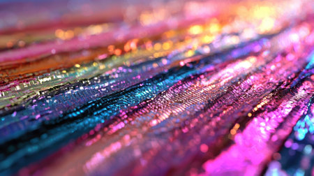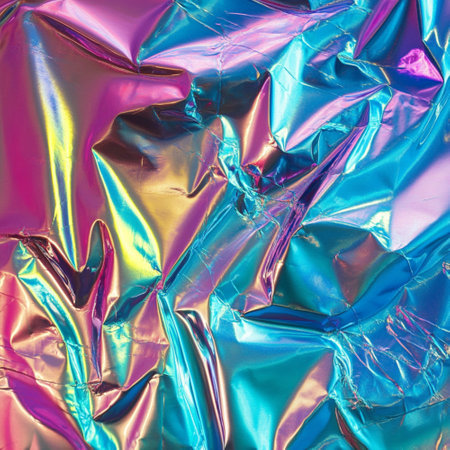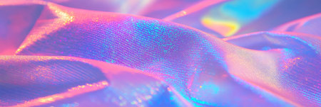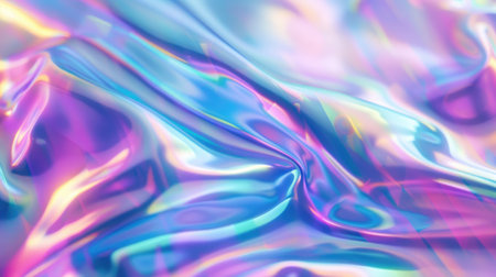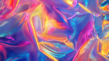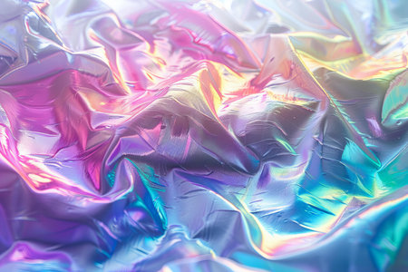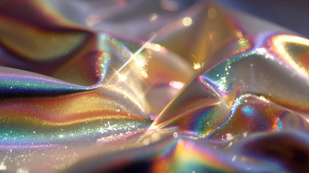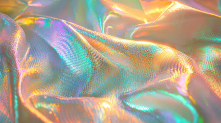 A captivating close-up of shimmering iridescent fabric displaying colorful reflections and gentle wrinkles. This image showcases intricate textures and a vibrant aesthetic perfect for various design projects.