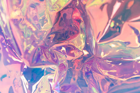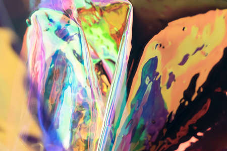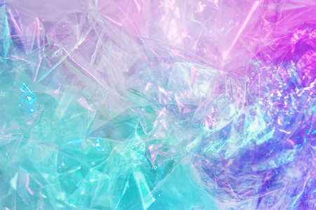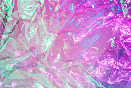 Holographic background in the style of the 80-90s. Real texture of cellophane film in bright acid colors.