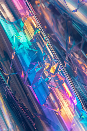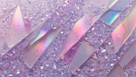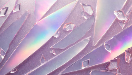 A mesmerizing holographic background showcasing glass shards with stunning rainbow reflexes in soft pink and purple hues. Ideal for creative projects, modern digital designs, and visual artistic