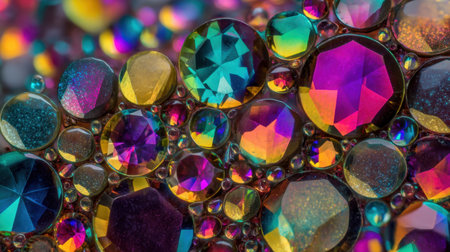 This captivating close-up showcases an assortment of colorful sparkling gems, reflecting a myriad of light and vibrant hues, creating an alluring visual impact.