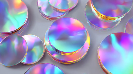 A collection of vibrant iridescent circles features a captivating play of color and reflections on a soft light surface. Ideal for creative projects.