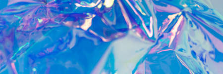 Blue defocused holographic banner. Crumpled foil material. Rainbow fluid textured background.