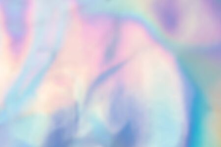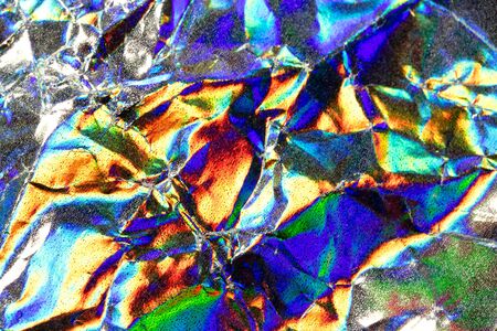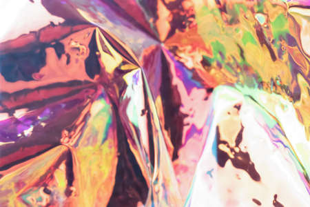 Defocused iridescent holographic background. Blurred colorful texture of wrinkled foil.