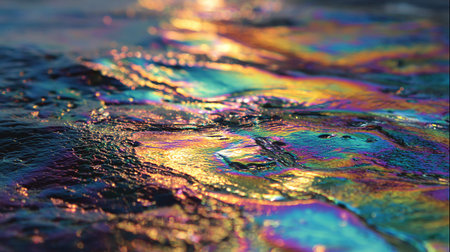 Close up abstract textured surface covered tiny iridescent crystals reflecting vibrant rainbow colors