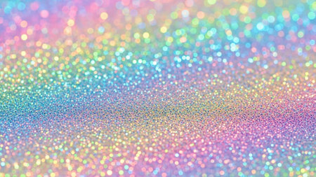 A close-up, macro view of a surface covered in fine glitter particles. The glitter reflects light, creating a bokeh effect with numerous small, circular points of light. The colors are a soft, blended spectrum of pastel rainbow hues, including pink, purple, blue, green, and yellow. The overall impression is one of gentle sparkle and ethereal beauty, with a soft focus that emphasizes the luminous of the glitter.