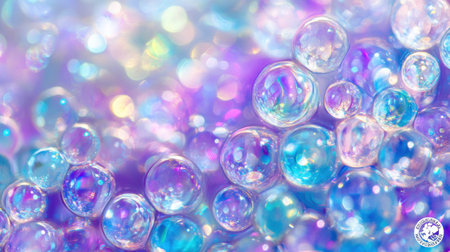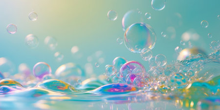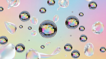 Iridescent bubbles and liquid drops float against a soft pastel gradient background with reflections.