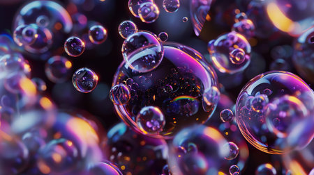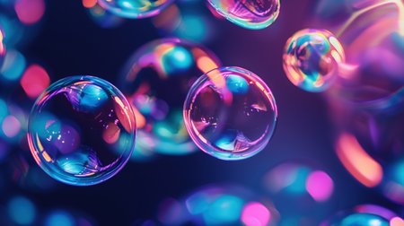 This captivating image showcases vibrant soap bubbles with a stunning iridescent glow. The intricate patterns and colors create a visually appealing abstract design.