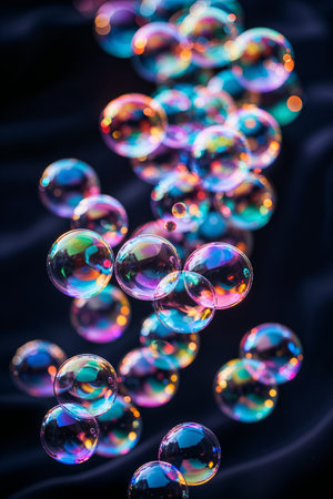 Colorful soap bubbles floating against a dark background creating a mesmerizing display of light and color